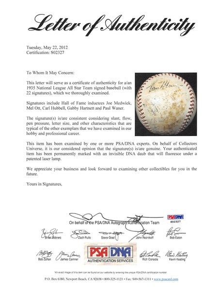 1935 Nl All Stars (22) Signed Onl Baseball Ott Medwick Hubbell Waner PSA #S02327