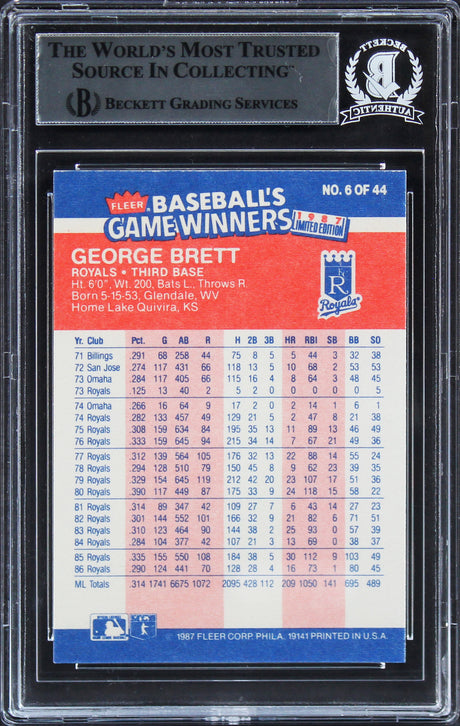 Royals George Brett Authentic Signed 1987 Fleer Game Winners #6 Card BAS Slabbed