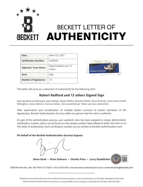 Up Close & Personal (13) Redford, Pfeiffer Signed 5x12 Placard Sign BAS #AC99547
