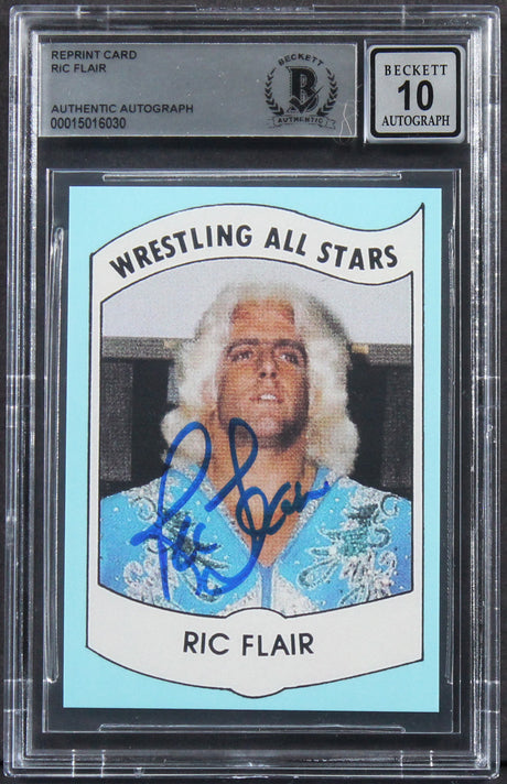 Ric Flair Signed 1982 Wrestling All Stars Rookie Reprint Card Auto 10! BAS Slab