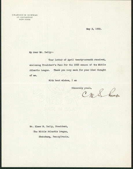 Charles Schwab Authentic Signed 8.5x11 Letter Dated May 2, 1933 BAS #AB76490