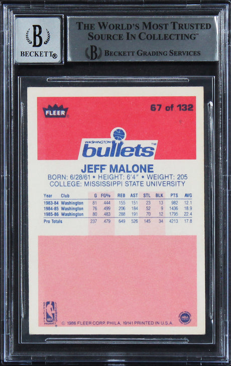 Bullets Jeff Malone "2x All Star" Signed 1986 Fleer #67 Card Auto 10 BAS Slabbed