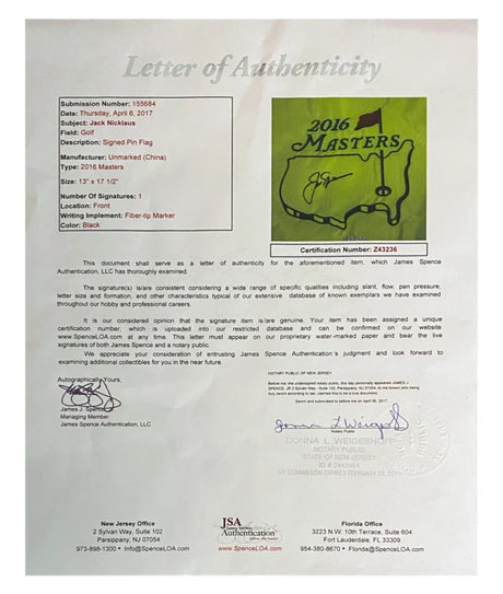 Jack Nicklaus Autographed 2016 Masters Pin Flag Custom Framed Display with Photos JSA