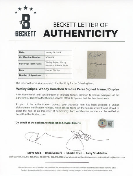 White Men Can't Jump (3) Snipes, Harrelson & Perez Signed 3x5 Framed Display BAS
