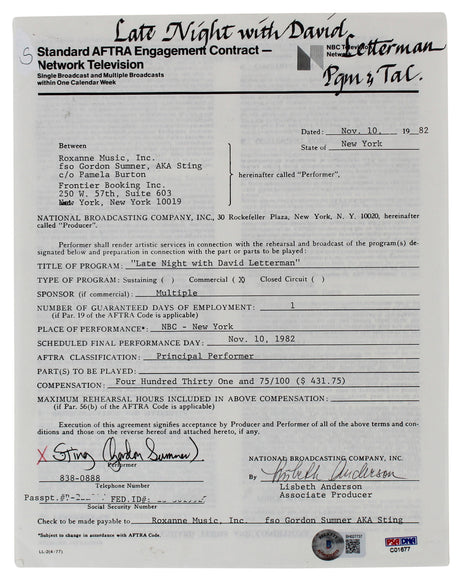 Sting Signed 8.5x11 1982 Late Night With David Letterman Contract BAS #BH027737