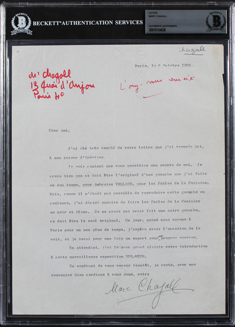 Marc Chagall Authentic Signed 8.25x10.5 1966 Typed Letter BAS Slabbed