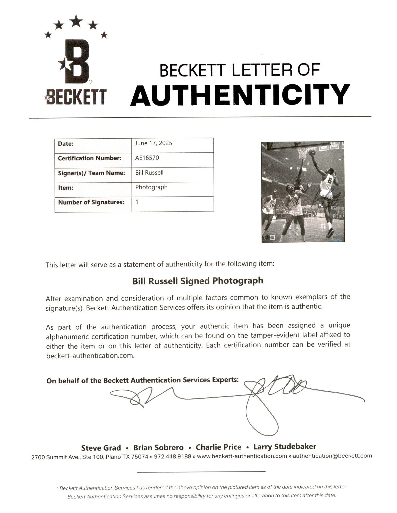Own a piece of basketball history with this Framed 8x10 Photo autographed by NBA legend Bill Russell. Measuring approximately 15x18 inches with the frame, this collectible showcases an authentic hand-signed signature from one of the most iconic figures in sports history. A cornerstone of the Boston Celtics dynasty, Bill Russell led the team to 11 NBA championships between 1957 and 1969, earning a reputation as one of the greatest defensive players the game has ever seen. His legacy extends beyond the court, making this item a must-have for collectors and fans alike. Certified by Beckett Authentication Services (BAS), this photo includes their tamper-proof hologram and a full-page Certificate of Authenticity for verified provenance.