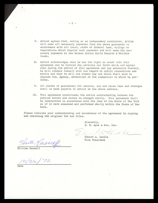 Own a piece of basketball history with this 1972 Advertising Document Contract personally hand-signed by NBA legend Bill Russell. Measuring approximately 8.5" x 11", this rare collectible is a must-have for serious memorabilia collectors and Boston Celtics fans alike.