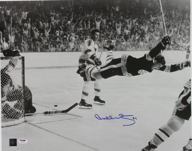 Own a piece of hockey history with this Bobby Orr Signed 16x20 Bruins Photo, featuring a perfect PSA/DNA Auto Grade of 10. This iconic image captures Orr’s legendary Stanley Cup-clinching goal on May 10, 1970, when he scored in overtime against the Blues—one of the most memorable moments in NHL history.