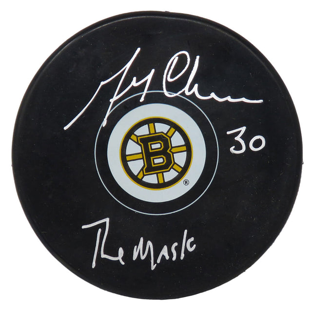 Gerry Cheevers signed Boston Bruins logo hockey puck with 'The Mask' inscription. Item comes with a Schwartz Sports Memorabilia tamper-proof numbered hologram and Certificate of Authenticity which can be verified online.