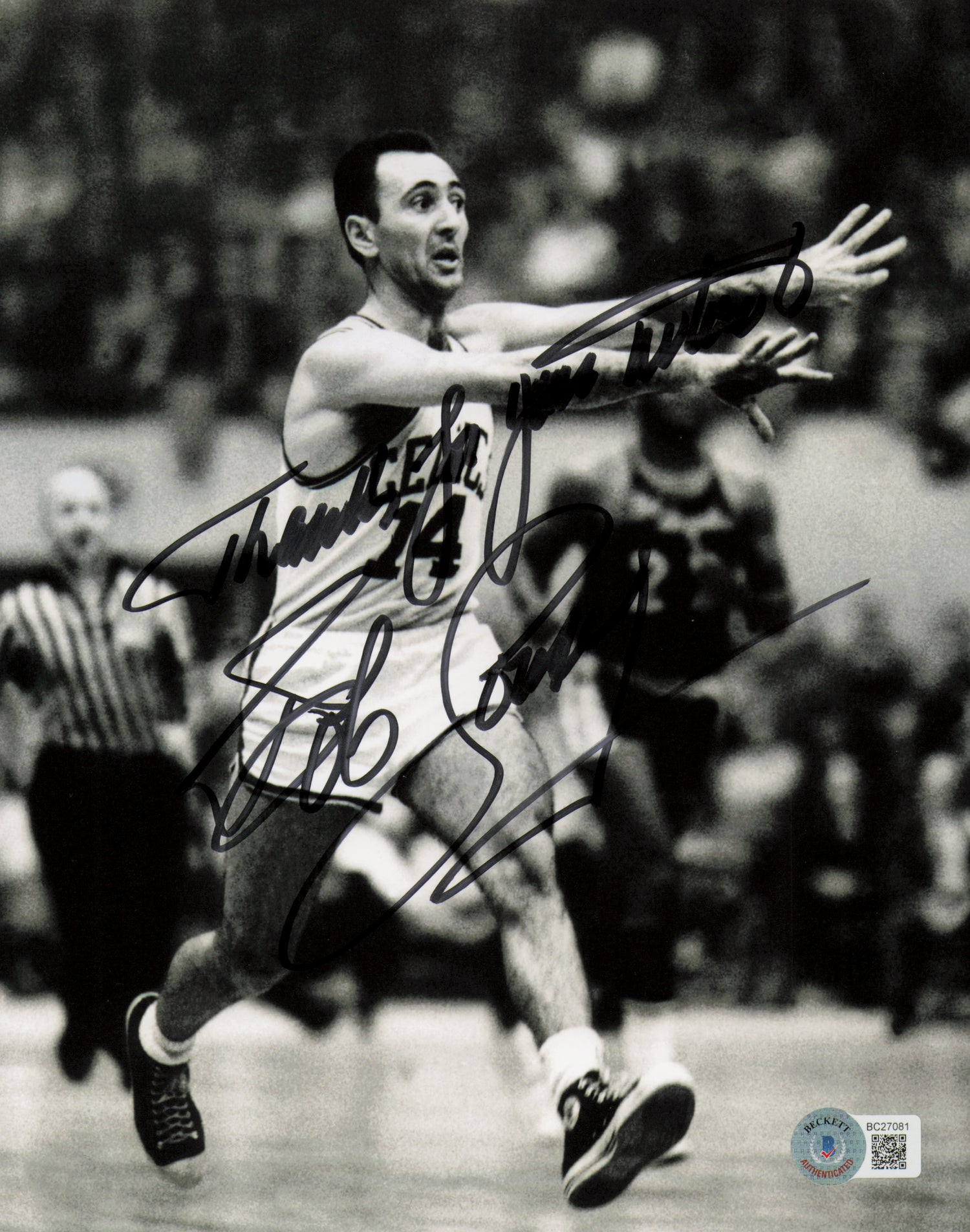 Celebrate the legacy of a basketball icon with this hand-signed 8x10 photo of Bob Cousy, an essential piece for any serious sports memorabilia collection. Known as “The Houdini of the Hardwood,” Bob Cousy revolutionized the point guard position during his legendary career with the Boston Celtics, leading them to six NBA Championships and earning 13 All-Star selections. This autographed photo is personally inscribed with "Thanks For Your Wishes," adding a rare, personal touch that elevates its collectible value. Authenticated by Beckett Authentication Services (BAS), this signed photo includes their tamper-proof QR Code hologram for instant verification and lifetime peace of mind.