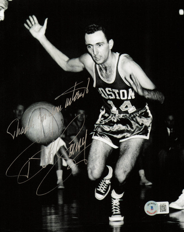 Celebrate the legacy of one of basketball's all-time greats with this authentic 8x10 photo hand-signed by Hall of Famer Bob Cousy. A true icon of the NBA’s golden era, Cousy helped shape the game with his unmatched court vision and leadership during his time with the Boston Celtics. This exclusive collectible features a heartfelt inscription, "Thanks For Your Wishes," making it a meaningful addition for fans and collectors alike. Authenticated by Beckett Authentication Services (BAS), this signed photo comes complete with a tamper-proof QR Code hologram for unbeatable peace of mind.