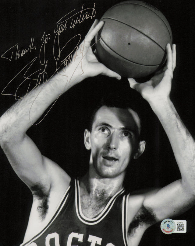 Add a legendary piece to your basketball memorabilia collection with this hand-signed 8x10 photo of Boston Celtics icon Bob Cousy. Known as one of the greatest point guards in NBA history, Cousy’s unmatched court vision helped shape the Celtics dynasty of the 1950s and 60s. This photo features a personal touch, hand-signed by Bob Cousy and inscribed with "Thanks For Your Wishes," offering a rare and heartfelt addition to any fan’s collection. Authenticated by Beckett Authentication Services (BAS), it comes with their tamper-proof QR Code hologram to guarantee authenticity and peace of mind.