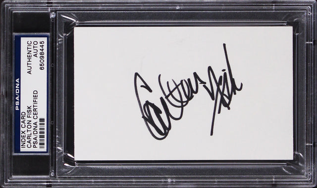 Own a piece of baseball history with this Carlton Fisk Autographed 3x5 Index Card, signed by the legendary Boston Red Sox catcher. A Hall of Famer known for his iconic walk-off home run in the 1975 World Series, Fisk remains one of the most celebrated figures in Red Sox history. This collectible is 100% authentic, professionally slabbed, and authenticated by PSA/DNA for guaranteed legitimacy.