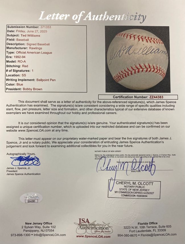 Celebrate baseball greatness with this Ted Williams signed official American League baseball, an iconic piece of MLB history. This authentic collectible was hand signed by Hall of Famer Ted Williams, one of the most legendary hitters in baseball, famously known as "The Splendid Splinter" and a lifetime Boston Red Sox icon. A timeless treasure for any serious collector or baseball enthusiast, this piece captures the legacy of a player who remains a symbol of excellence in America's pastime. Authenticated by JSA, this signed baseball is guaranteed to be 100% genuine and investment-worthy.
