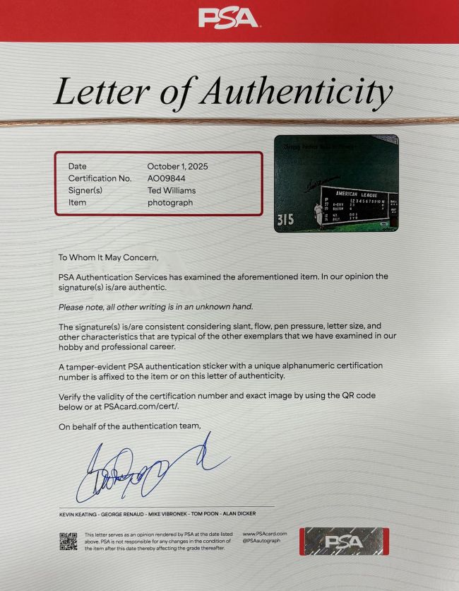 - Hand-signed by Ted Williams, Boston Red Sox legend and MLB Hall of Famer