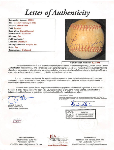 Red Sox Jimmie Foxx Authentic Signed Baseball Autographed JSA #ZZ21175