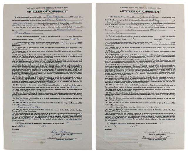George Foreman & Aaron Eastling Signed 8.5x14 1970 2 Page Fight Contract BAS