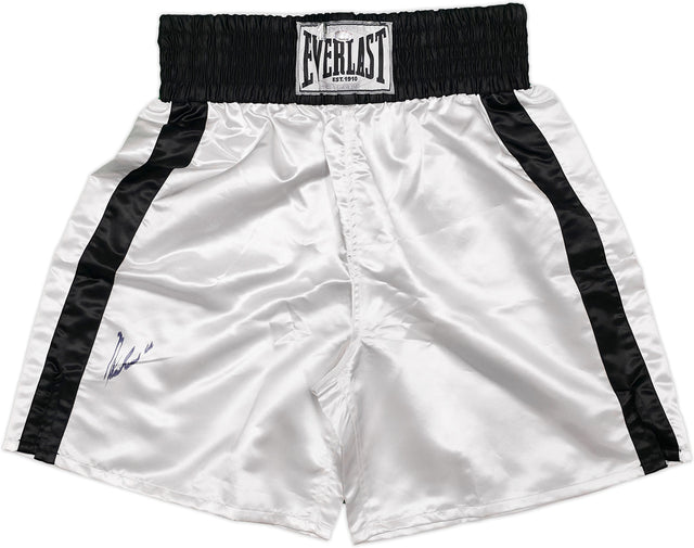 - Authentic Muhammad Ali Autograph: Boldly hand-signed on a pair of classic White & Black Boxing Trunks.