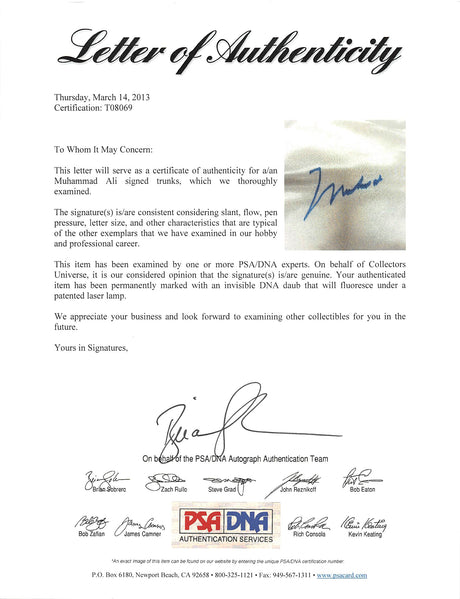 - Ships FreeMuhammad Ali Authentic Signed White Ali Boxing Trunks PSA/DNA Itp #4A01724 Very low stock (1 unit)$3,569Unit price /Unavailable