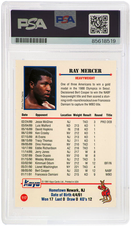 $139Unit price /UnavailableRay Mercer Signed 1991 Kayo Boxing Trading Card #117 w/36-7-1, 26 KO's - (PSA Encapsulated)