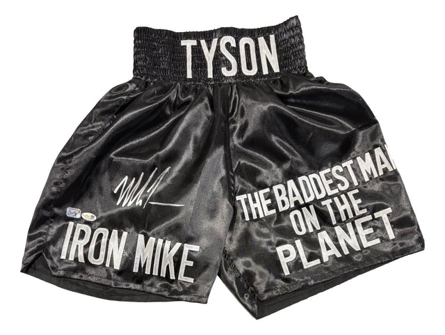 Mike Tyson Signed Custom Black Baddest Man Boxing Trunks JSA QR Hologram