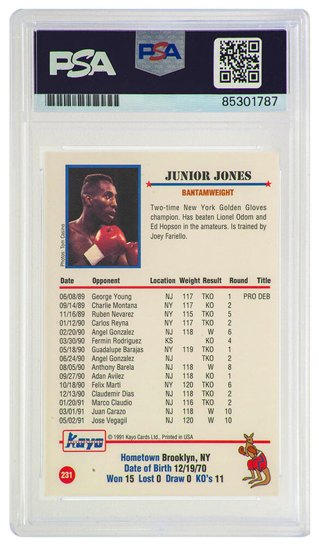 Very low stock (2 units)$199Unit price /Unavailable Junior Jones Signed 1991 Kayo Boxing Card #231 w/Poison - (PSA Encapsulated)