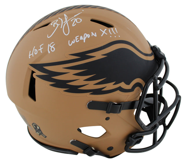 Own a piece of Philadelphia Eagles history with this Autographed Alternate 2023 Salute to Service II Riddell Authentic Full-Size Speed Proline Helmet, personally signed by Brian Dawkins with the exclusive inscription "HOF 18, Weapon X." This collectible is a must-have for devoted Eagles fans and serious memorabilia collectors.
