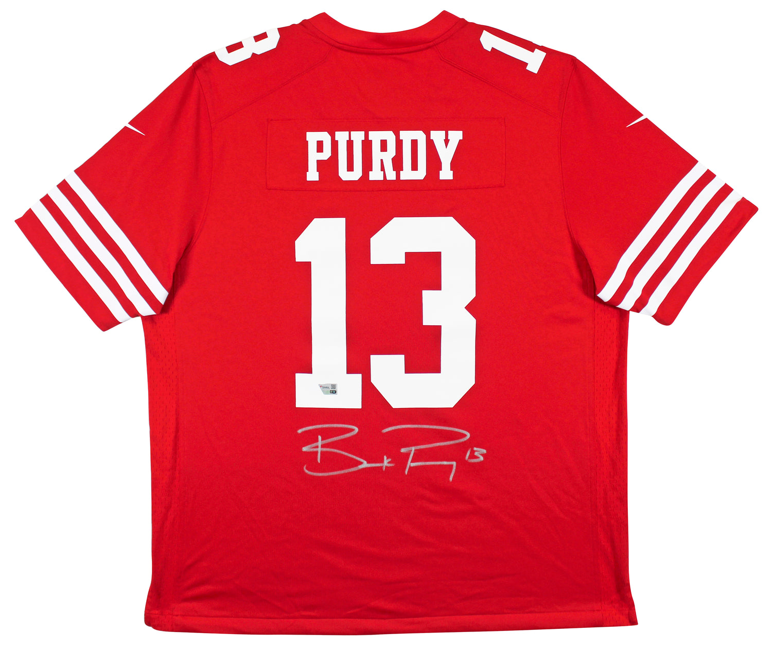 This Authentic Red Nike Game Jersey has been personally hand-signed by Brock Purdy, the rising star quarterback of the San Francisco 49ers. A must-have for dedicated 49ers fans and memorabilia collectors, this jersey represents Purdy’s growing legacy in the NFL. Certified 100% authentic, it comes with a Fanatics numbered hologram for official verification, ensuring its legitimacy as a prized collectible. Each autograph was obtained during an exclusive signing session with Brock Purdy, making this jersey a standout addition to any sports memorabilia collection. Due to the nature of hand-signed items, autograph size, placement, and strength may vary, making each piece truly unique. Product Details:
