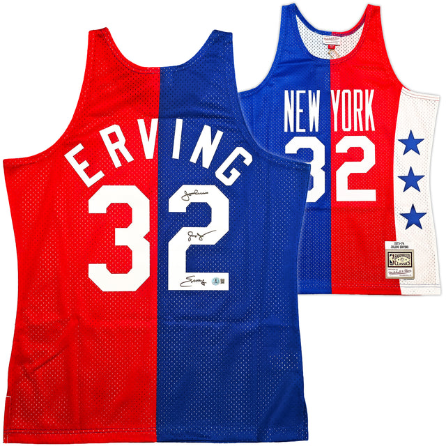 New York Nets Julius "Dr. J" Erving Autographed Red & Blue Authentic Mitchell & Ness 1973-74 HWC Swingman Jersey Size L Beckett BAS Witness Stock #253701