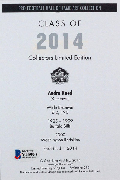 $59Unit price /UnavailableAndre Reed Autographed Buffalo Bills Goal Line Art Card w/ HOF- Beckett *Blue