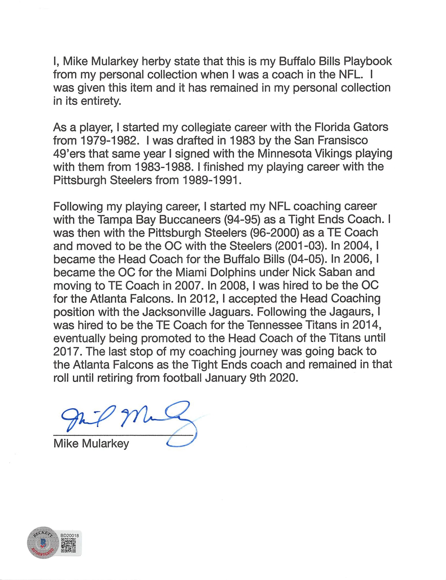 - Authentic Signature – Personally signed by former Buffalo Bills head coach Mike Mularkey.