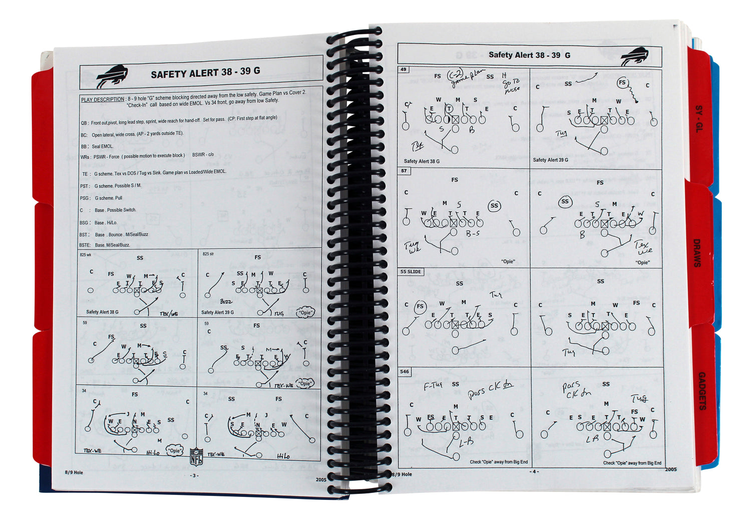 Own a unique piece of Buffalo Bills history with this Autographed 2004-05 Offensive Playbook, personally signed by Mike Mularkey and inscribed with "Go Bills!". A must-have for passionate Bills fans and collectors, this playbook offers a rare glimpse into the strategic planning of the 2004-05 season.