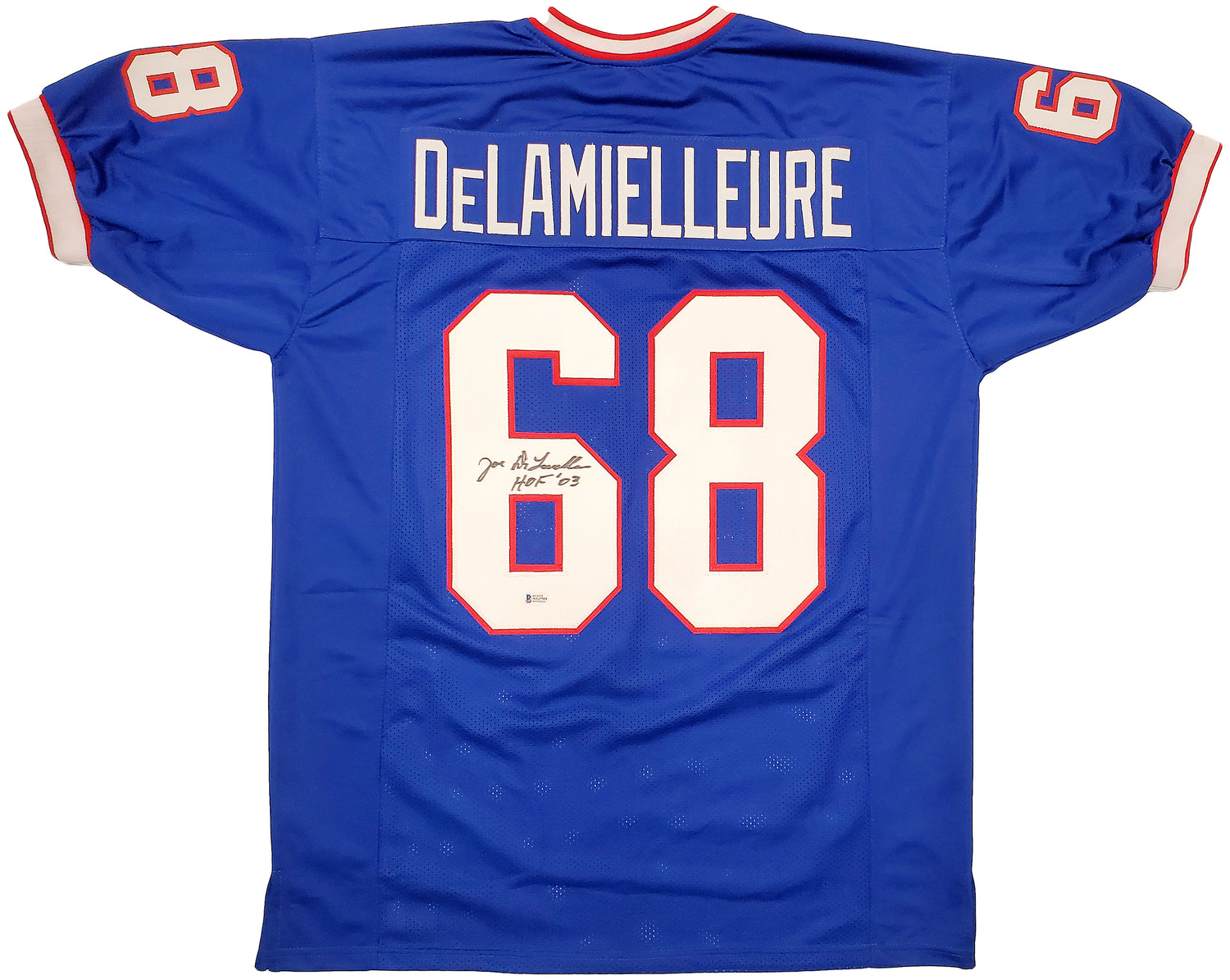 Buffalo Bills Joe DeLamielleure Autographed Blue Jersey "HOF 03" Beckett BAS Stock #196490 is backordered and will ship as soon as it is back in stock.