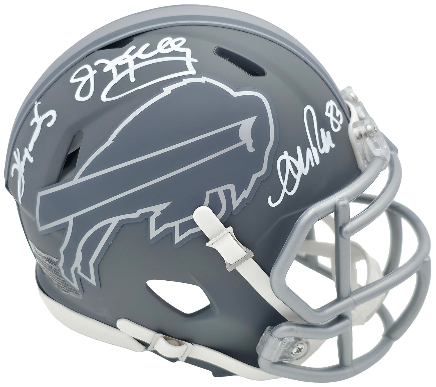 Own a piece of Buffalo Bills history with this Slate Gray Speed Mini Helmet, hand-signed by legendary Hall of Famers Jim Kelly, Thurman Thomas, and Andre Reed. These three icons were instrumental in the Bills' dominant run during the late 1980s and early 1990s, leading the team to four consecutive Super Bowl appearances. This collectible is a must-have for passionate Bills fans and sports memorabilia collectors alike.