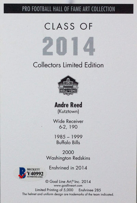 Very low stock (1 unit)$89Unit price /UnavailableAndre Reed Autographed Buffalo Bills Goal Line Art Card w/ HOF- Beckett *Black