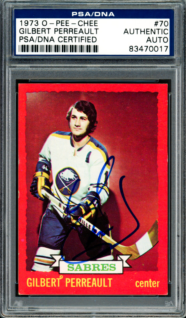 This rare and collectible 1973-74 O-Pee-Chee Card #70 has been hand signed by NHL Hall of Famer Gil Gilbert Perreault, a legend of the game and cornerstone of the Buffalo Sabres franchise. Known for his electrifying speed and unmatched stickhandling, Perreault was the first-ever draft pick for the Sabres and went on to define an era of hockey excellence in Buffalo. Authenticated by PSA/DNA, this card is encapsulated in a tamper-proof holder for long-term protection and investment-grade quality. A must-have for vintage hockey card enthusiasts and fans of classic 1970s NHL memorabilia.