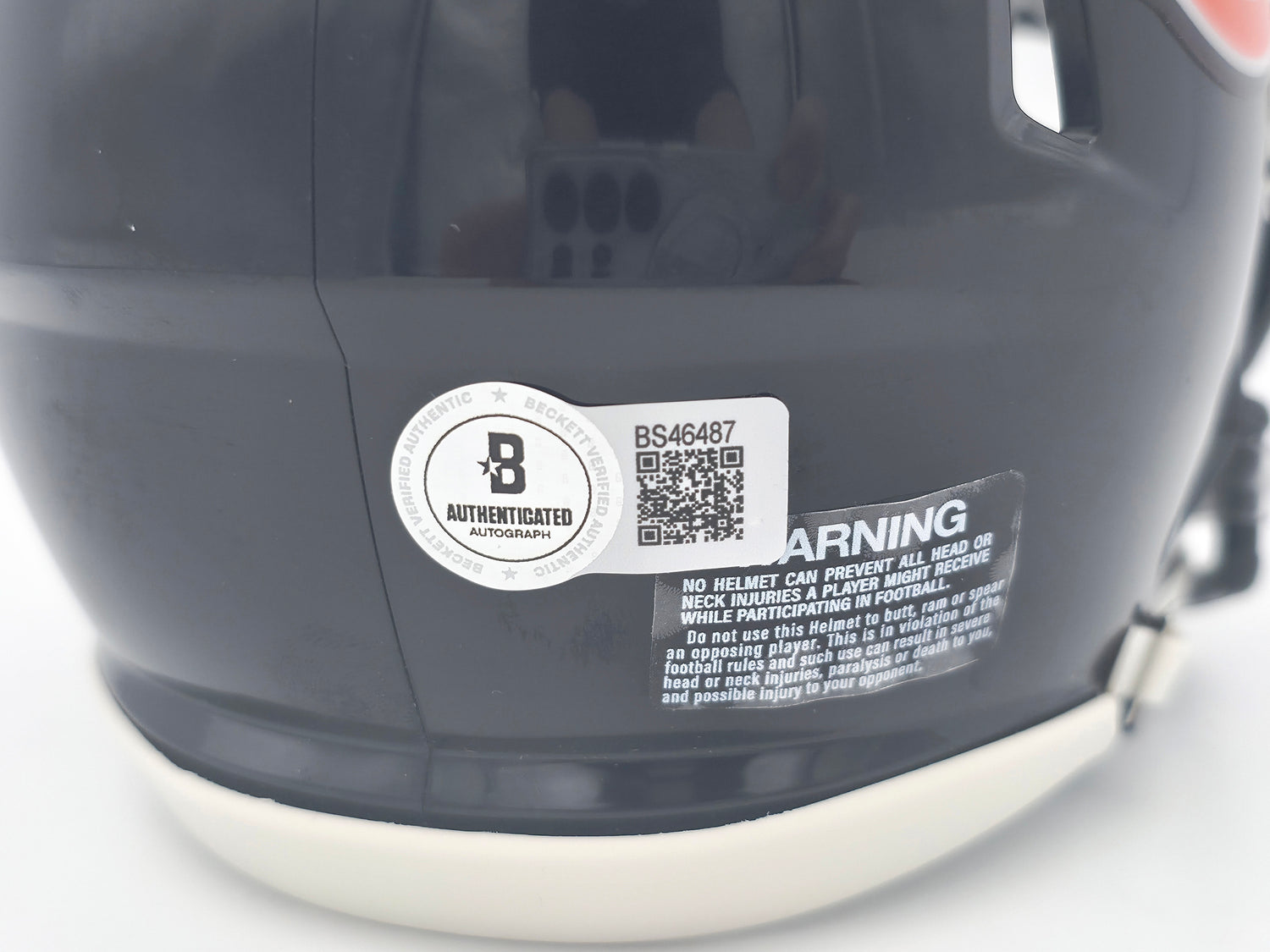 Celebrate one of the most electrifying return specialists in NFL history with this Devin Hester autographed Chicago Bears Blue Speed Mini Helmet. Known for redefining the return game, Hester's incredible career with the Chicago Bears earned him a reputation as a game-changer on special teams. This eye-catching blue mini helmet has been personally hand-signed by Devin Hester, making it a perfect addition for any die-hard Bears fan or serious football memorabilia collector. While there is a slight imperfection in the signature, it does not diminish the item's authenticity or collector value. Fully authenticated by Beckett Authentication Services (BAS), this piece comes with their tamper-proof QR code hologram for instant verification.