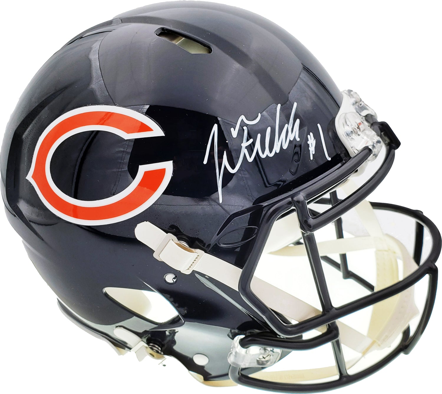 Own a piece of Chicago Bears history with this Chicago Bears Blue Full-Size Authentic Speed Helmet, hand-signed by star quarterback Justin Fields. A must-have for any devoted Bears fan or collector, this autographed helmet showcases Fields’ rising legacy in the NFL and his impact on the game.