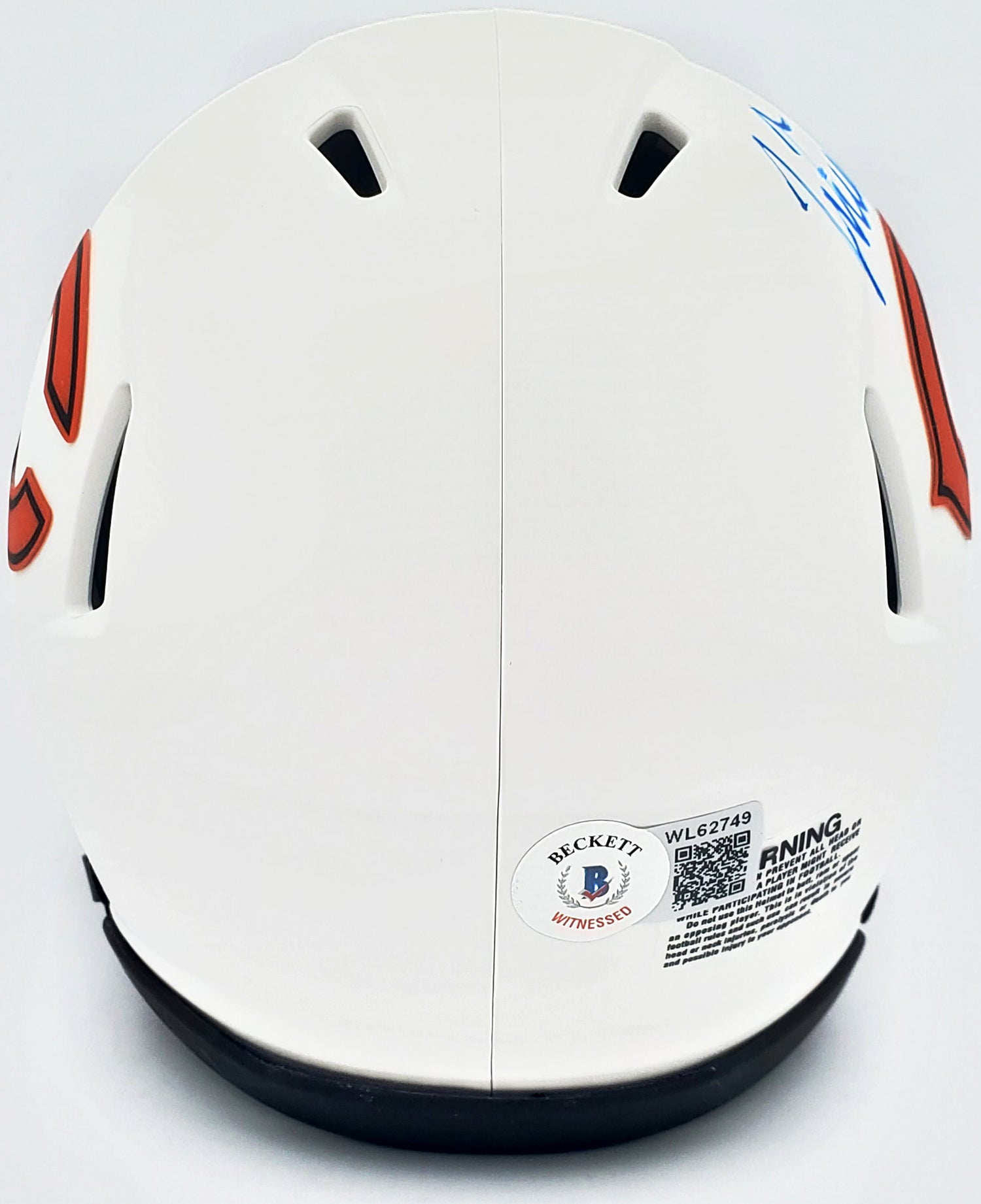 Own a piece of Chicago Bears history with this Justin Fields Signed Chicago Bears Lunar Eclipse White Speed Mini Helmet. This striking collectible features a bold hand-signed autograph from the Bears' dynamic quarterback, making it a must-have for dedicated fans and memorabilia collectors.
