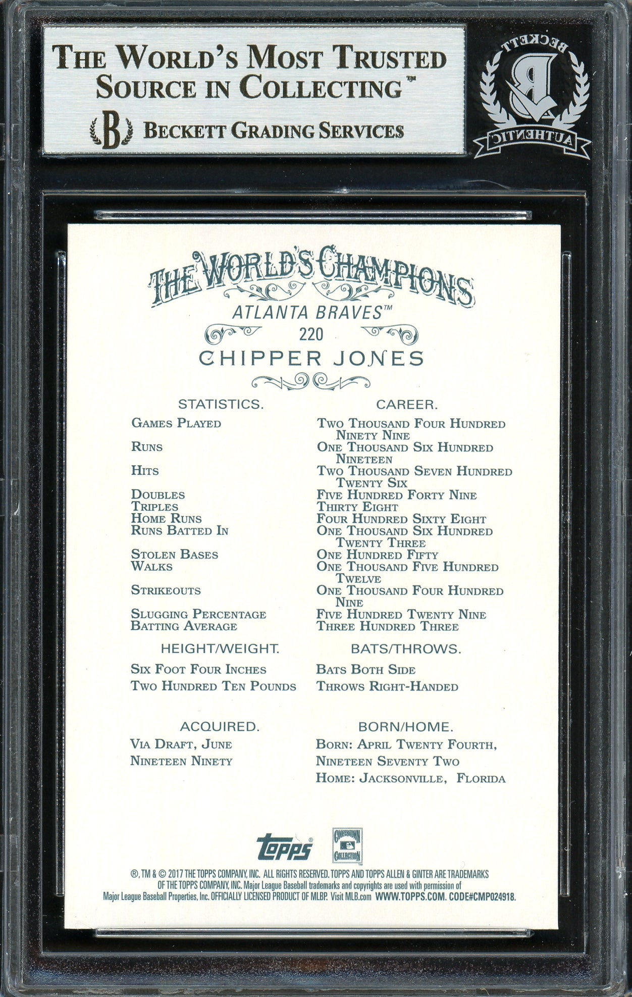 Own a piece of baseball history with this 2017 Topps Allen & Ginter Card #220, hand-signed by Chipper Jones, one of the greatest switch-hitters in MLB history. This iconic card has been authenticated by Beckett Authentication Services (BAS) and comes securely encapsulated in their tamper-proof holder, ensuring long-term protection and authenticity.