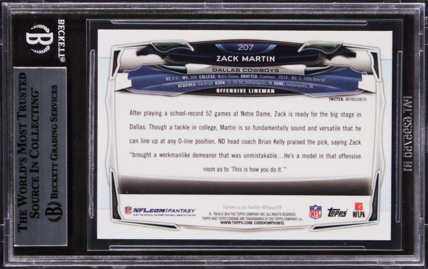This Autographed 2014 Topps Chrome #207 Rookie Card is a must-have for any serious Dallas Cowboys fan or football card collector. Personally signed by Zack Martin, this rare collectible highlights the early career of one of the NFL's most dominant offensive linemen. Authenticated and slabbed by Beckett Authentication Services (BAS), this card ensures 100% authenticity, making it a valuable investment for collectors and Cowboys enthusiasts alike. Verify its authenticity anytime on the Beckett Authentication Services website.