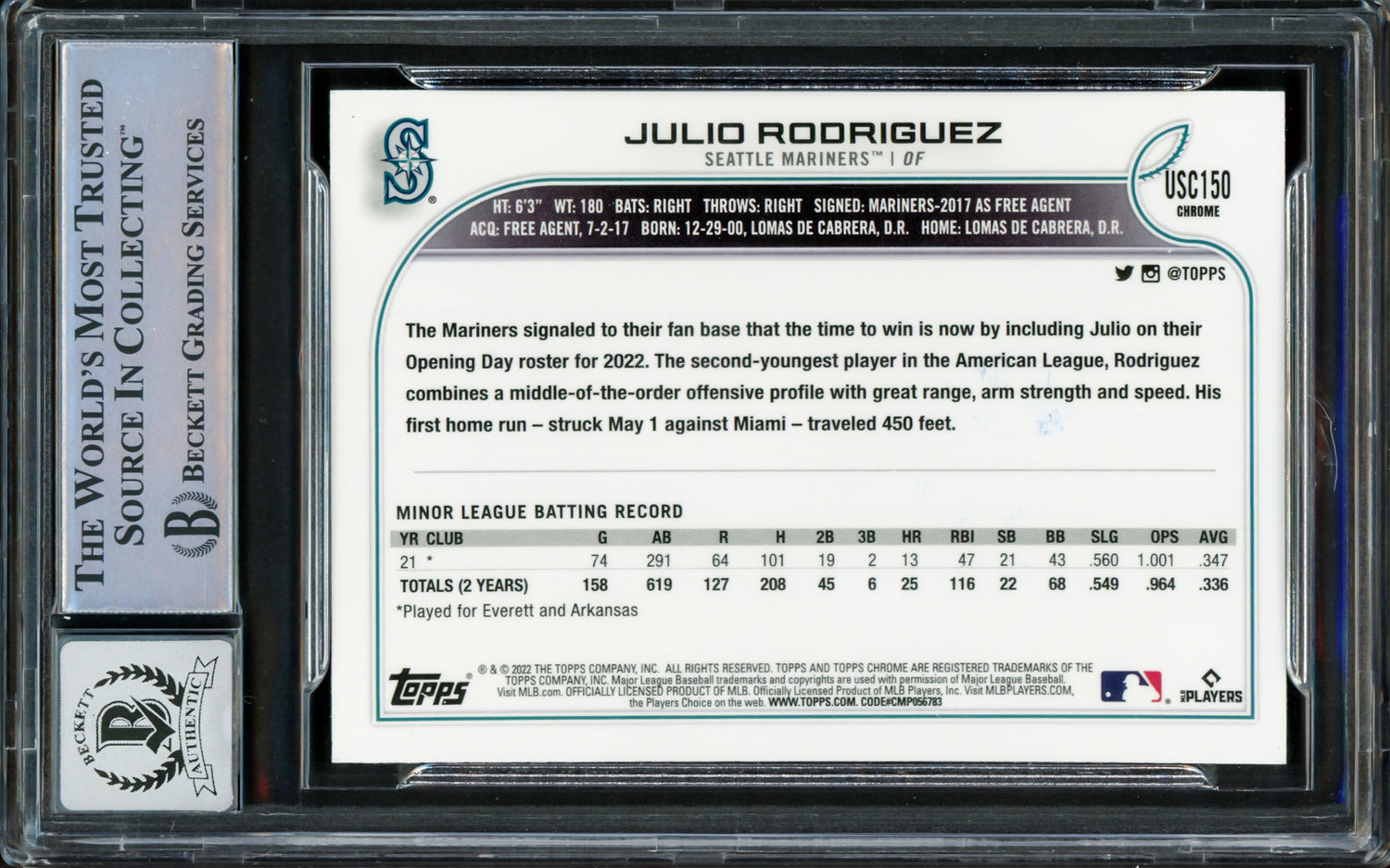 Julio Rodriguez Autographed 2022 Topps Chrome Update Rookie Card #USC150 Seattle Mariners Auto Grade Gem Mint 10 Beckett BAS Stock #222882