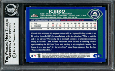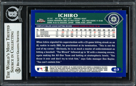 Ichiro Suzuki Autographed 2003 Topps Chrome Card #63 Seattle Mariners Beckett BAS #12785964