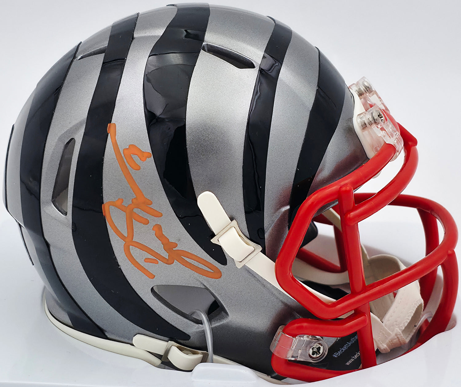 Add a legendary piece to your collection with this Cincinnati Bengals Flash Silver Speed Mini Helmet autographed by Boomer Esiason. A standout quarterback of the 1980s and 1990s, Boomer Esiason led the Bengals to Super Bowl XXIII and earned NFL MVP honors in 1988. His signature on this striking silver mini helmet makes it a perfect addition for Bengals fans and memorabilia collectors alike. Authenticated for your peace of mind, this mini helmet is a must-have for fans of NFL history and Cincinnati Bengals legacy. Certified by Beckett Authentication (BAS), this collectible includes their tamper-proof witness hologram to guarantee authenticity.