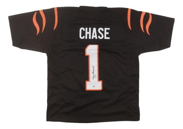 Own a piece of gridiron greatness with this Ja'Marr Chase signed custom football jersey—an exceptional collectible for Cincinnati Bengals fans and football memorabilia enthusiasts alike. Known for his explosive speed and game-changing plays, Ja'Marr Chase has quickly become one of the NFL’s most electrifying wide receivers since being drafted by the Cincinnati Bengals in 2021. Now, you can commemorate his breakout career with this authentic, hand-signed jersey.