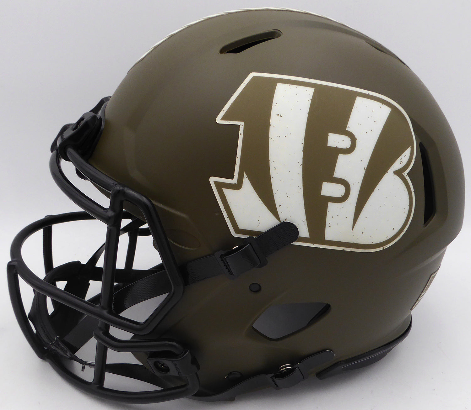 Celebrate your Bengals pride with this exclusive Cincinnati Bengals Salute To Service Full Size Replica Helmet autographed by star wide receiver Tee Higgins. Combining military-themed styling with gridiron legacy, this replica helmet is more than a collector’s item—it's a tribute to both the franchise and the heroes who serve. This limited piece has been personally signed by Tee Higgins, one of the Cincinnati Bengals’ most promising offensive talents. Whether you're a dedicated Bengals fan, a sports memorabilia collector, or searching for the ultimate gift, this autographed helmet delivers authenticity and timeless value.