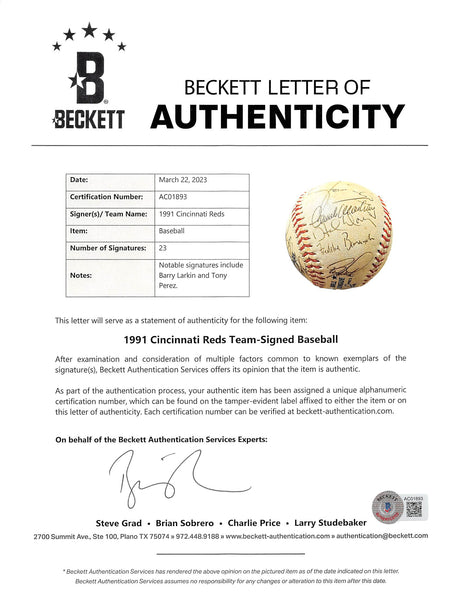 1991 Reds (23) Larkin, Perez Authentic Signed Onl Baseball BAS #AC01893