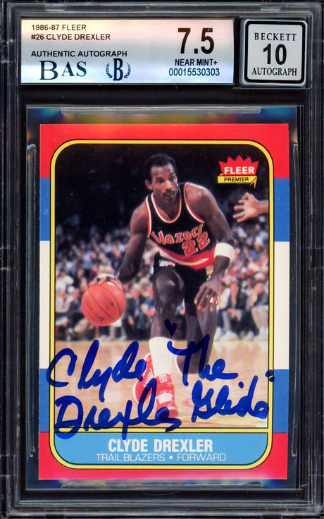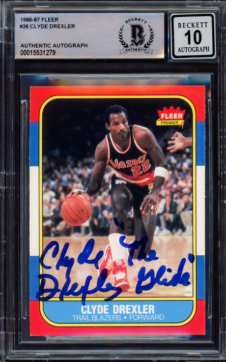 Blazers Clyde Drexler "2x Insc" Signed 1986 Fleer #26 RC Card Auto 10! BAS Slab