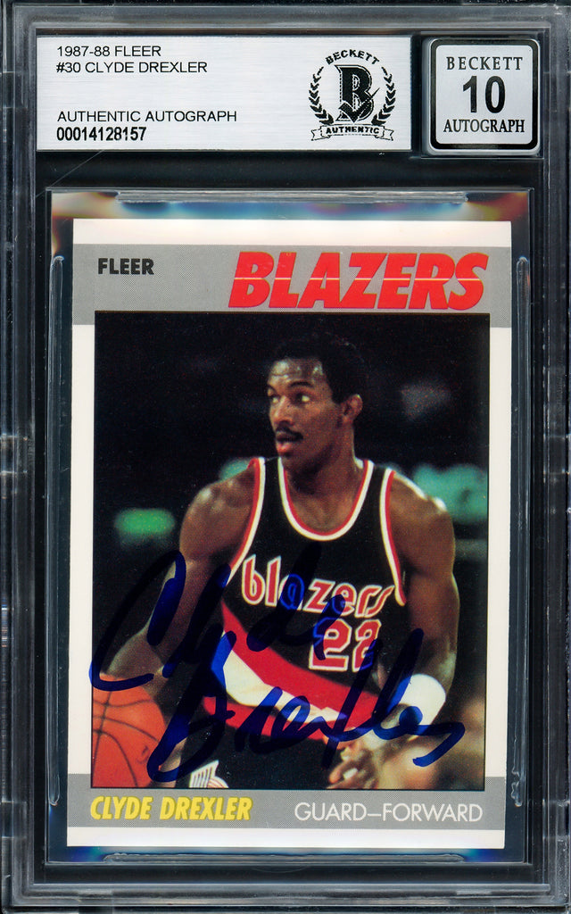 Clyde Drexler Autographed 1987-88 Fleer Card #30 Portland Trail Blazers Auto Grade Gem Mint 10 Beckett BAS Stock #205728